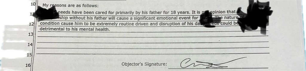 The day I retained my divorce attorney, I had asked what would happen with our disabled adult son. The attorney advised that he wouldn’t be a part of the divorce because son was already an adult. He stated that whoever filed for guardianship first had a leg up and the opposing party would be playing catch up. He wasn’t a guardianship attorney and I couldn’t afford another retainer for a second attorney so I filed on my own. I served Ex with the guardianship filing. He was furious. After all, he had been trying to bargain uncontested ‘custody’ in exchange for no support.