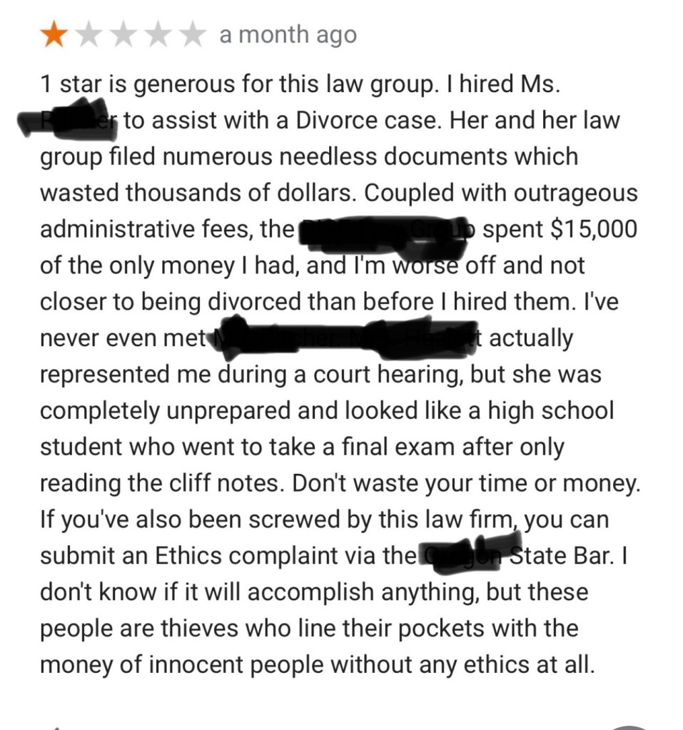 Shortly after that, my attorney received notification that Ex’s attorney was officially withdrawing over irreconcilable differences between her and Ex. I believe I remember laughing out loud. His down and dirty attorney met the real behind closed doors Ex and it didn’t go well. I told my attorney I bet Ex leaves her scathing reviews online and files a formal complaint with the state bar against her. He filed complaints against 2 attorneys representing him when it was him and ex-wife. And I started looking for reviews online.