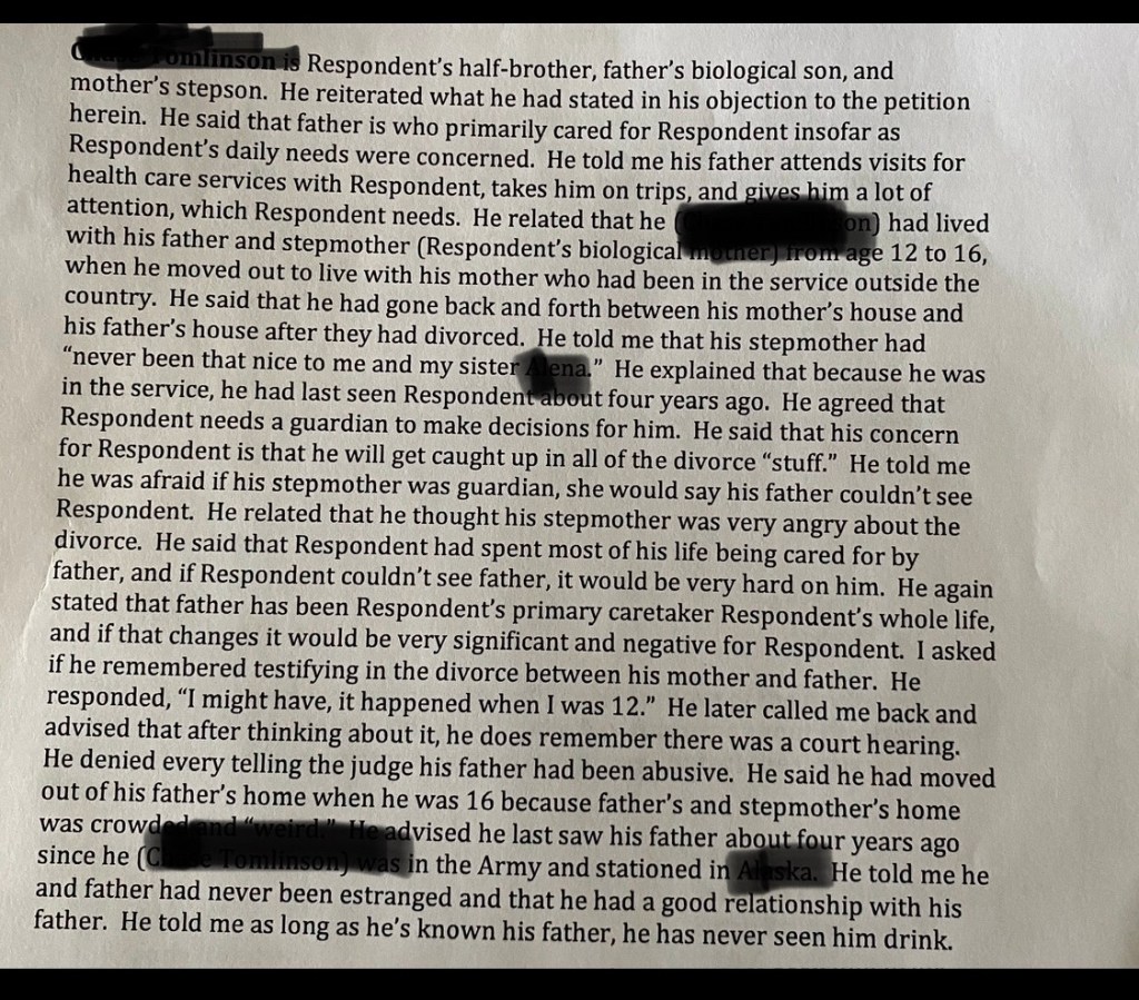 The second visitor’s report was very detailed which was also a far cry from the first visitor. Nearly a whole page of her report was her interview with Step-son. It was quite obvious she didn’t find stepson credible.